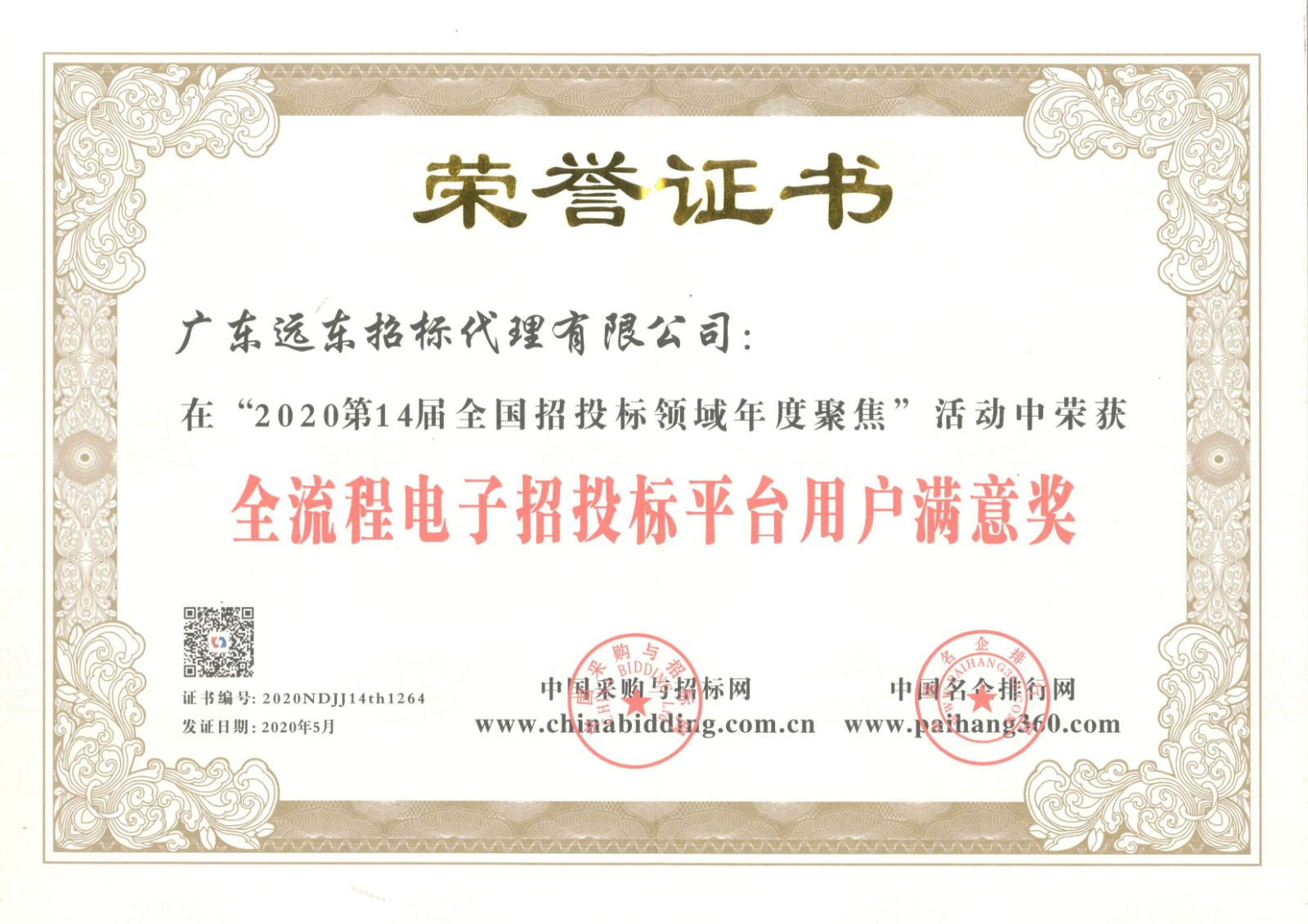 2020全流程電子招投標(biāo)平臺(tái)用戶滿意獎(jiǎng)